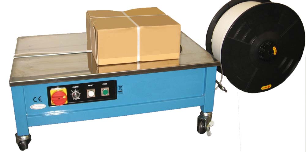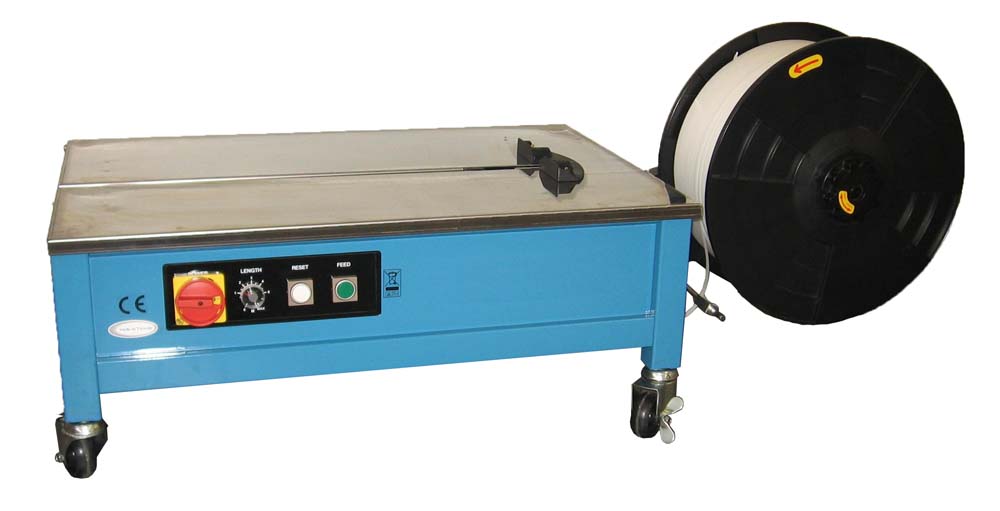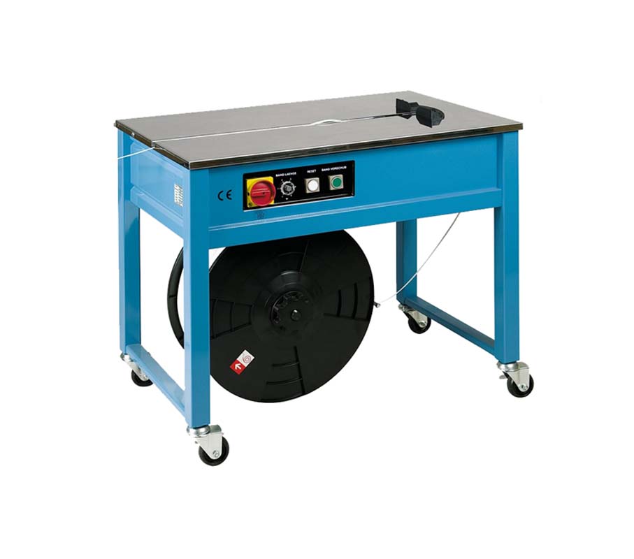 La reggiatrice semiautomatica mod. TP202 è particolarmente idonea per reggiare rapidamente colli di qualunque dimensione. La procedura è molto semplice e rapida: si appoggiano i colli da reggiare sul piano, si prende l’estremità della reggia e la si fa passare attorno, inserendo l’estremità nella canalina. A questo punto la macchina trascina la reggia, la tende fino alla tensione desiderata (regolabile) quindi la salda a caldo, taglia l’estremità e prepara il lancio successivo
