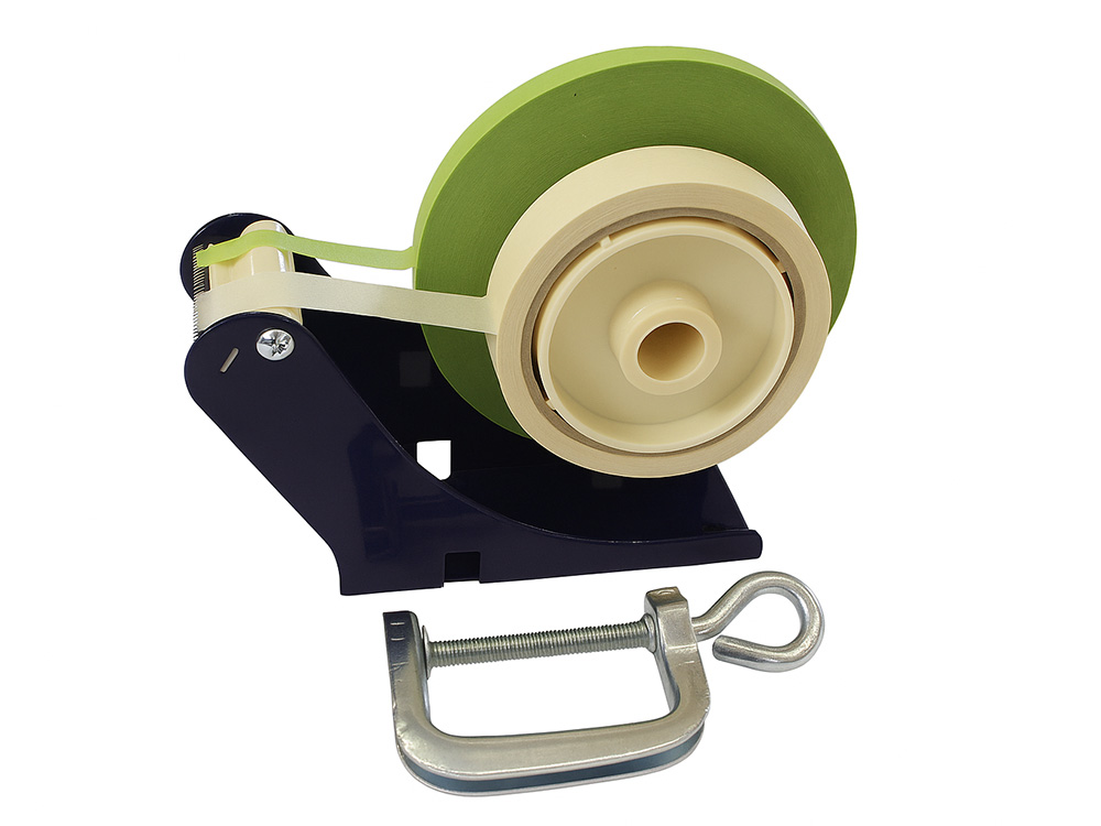 Dispenser da banco con morsetto per il fissaggio al banco, con larghezza max. del nastro 50mm ma utilizzabile anche contemporaneamente con 2 nastri da 25 mm. Il diametro del portarotolo è da 3” (76 mm)